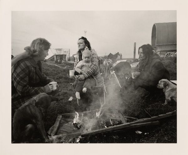 Curator: Larry Fink captured this intriguing black and white photograph, “Graduation, Bangor High School, Bangor, Pennsylvania,” in 1979, using a gelatin-silver print technique. Editor: It’s a striking image. The sharp contrast between the light sky and the weighty figures creates a certain unease. All those stripes in the frame—almost oppressive. Curator: It’s interesting you mention the stripes. Fink often uses framing and composition to highlight social dynamics, drawing attention to details we might otherwise overlook at such public events. Graduation, as a social ritual, carries expectations. What might Fink be hinting at? Editor: Well, consider the material reality. Those are rough-hewn wooden steps, that looks like industrial metal; all captured with that stark silver gelatin process. There's nothing glamorous here. The choice of black and white emphasizes texture, the sheer weight and feel of everything. It speaks of labor, production. The adult figure looms large, almost blocking our view of the other onlookers in the background. Curator: Precisely! The adult’s posture could represent the weight of expectation placed on these graduating students. Fink photographed many events, interested in how those occasions reflected larger societal structures and the emotional realities within those structures. Editor: The image’s graininess and those gritty materials give the photograph an almost documentary feel. Fink isn't just capturing a graduation, but maybe commenting on class and labor in this Pennsylvania community. Look at how the faces in the background are blurry, whereas he puts all of the details into showing these specific individuals. Curator: It also suggests a moment in time that might normally pass unnoticed. The act of elevating this in a museum raises questions about what we value and the politics of everyday representation. The very act of him being there as an observer… Editor: Definitely! The physicality is almost overwhelming. But the way it's shown suggests a sense of immediacy but it also isolates, allowing the viewer to analyze those relations, their placement in time and place through material documentation. I think the focus on medium heightens that reality. Curator: Looking at "Graduation," then, reminds us of how artistic choices subtly shape our understanding of public events. Fink captured more than a simple moment in 1979. Editor: Absolutely. He transformed the medium and that particular setting in Pennsylvania into a lens for thinking about social class, labor, and the silent observers always on the periphery of the next graduation class.