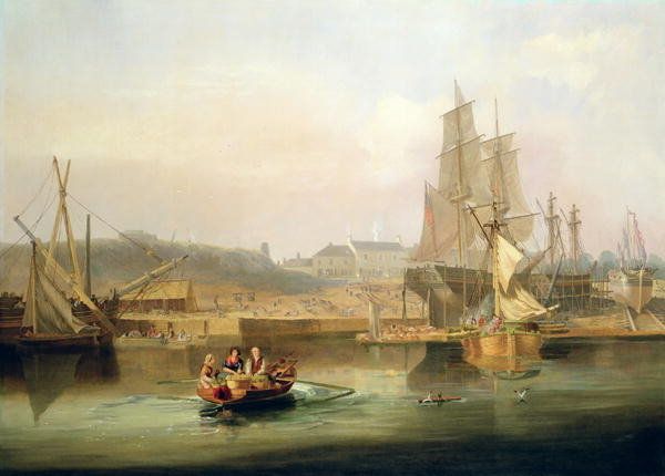 Curator: Looking at Charles Martin Powell's 1820 oil painting, "A Third-Rate Entering Port Mahon," I'm immediately struck by the depiction of naval power against the backdrop of everyday life. Editor: I see it differently; what grabs me is the immediacy of labor. Look at those small boats and the scale of the vessels in the distance! It emphasizes the physical effort required to navigate this port. I’m interested in how the artist makes the materials visible, not just of the ships, but the stone and coastline. Curator: Indeed. This isn't just a portrait of ships, it reflects Britain's increasing interest in the Mediterranean in the 19th century, part of the Orientalist fascination influencing artistic choices. Editor: Let's talk about the materials, though. The stone quay walls feel so permanent compared to the fleeting nature of the clouds and water. I wonder where it came from. How did the construction influence society? Curator: The way the painting portrays space—how the distant ships and structures appear almost ethereal. It evokes a sense of grand adventure, though maybe filtered through rose-tinted colonial lenses. Think of how these scenes played out for diverse communities, especially people of color. Editor: Good point. But the actual labor needed to build that fort and sail those ships must have shaped social interactions and determined fates, not just inspired artists like Powell. These realities have material consequences, too. It's an empire fueled by human effort and the consumption of materials. Curator: The artist’s subtle layering of light does imbue the scene with a Romantic glow—which complicates this vision. Editor: So many overlooked hands contributed to this portrayal. A more comprehensive view challenges traditional understandings of this painting beyond just "history painting". Curator: Reflecting on this, it's important we consider multiple layers. It prompts discussion regarding artistic and political interpretation of identity at the time. Editor: Absolutely. Focusing on production helps ground such readings, uncovering marginalized stories and hidden histories, that we really ought to remember.