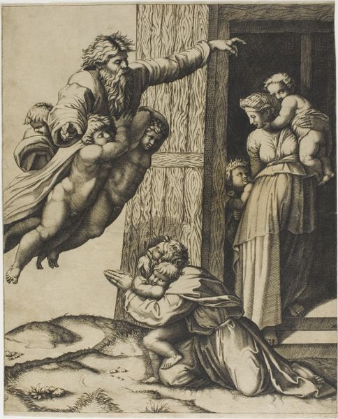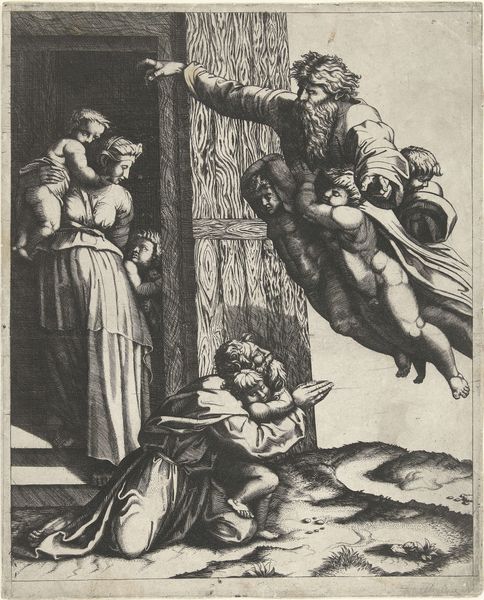 Editor: Here we have "God Appears to Noah After the Flood," a 16th-century engraving currently housed in the Rijksmuseum. The weight of the figures and the use of shadow immediately grab your attention, making it a dramatic interpretation of this scene from the Bible. How would you interpret this image? Curator: Immediately, I see a representation deeply embedded in a tradition of visually interpreting sacred text. Consider the weight of God's figure, literally supported by cherubs, acting as both a divine presence and a visual declaration of power. What emotions do the reactions of Noah and his family evoke in you? Editor: There's definitely awe, maybe a bit of fear. Noah is on his knees, head bowed, while the family huddle at the door, unsure how to react. It strikes me as the contrast of old tradition bowing down to a more modern one. Curator: The positioning, even in the background, speaks to a lineage of symbolic visual communication. God emerging with child-like figures symbolizes purity, forgiveness, a new covenant, quite different from a more aged view on life, which in turn adds weight to Noah and his family at the doorstep, steeped in worldly sin. Editor: So the artist is using recognizable visual cues, playing with contrasts and historical meaning to enhance the narrative of the piece? Curator: Precisely. And by understanding those visual traditions, the engraving is charged by their history; we access more of its narrative power, tapping into deeply entrenched cultural memory. Consider this – each element is not just seen, but *read*. What is this “reading” accomplishing here? Editor: It gives a depth to the narrative beyond just the biblical story, it suggests the ongoing struggle between human frailty and divine grace. Curator: Exactly. Through recognizable visual symbolism, this artwork provides a connection to themes resonating throughout centuries, a testament to art’s enduring role in reflecting and shaping our understanding of faith. Editor: Thank you! I have a better understanding of how artists communicate ideas by tapping into commonly held imagery and historical context.