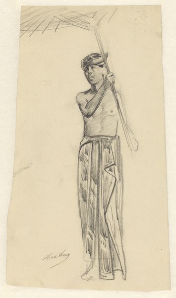 Editor: We're looking at "Standing Boy with a Spade" by Jozef Israëls, created sometime between 1834 and 1911. It’s a pencil drawing on paper. The mood is quite somber, don’t you think? He looks almost burdened. What catches your eye in this seemingly simple sketch? Curator: The spade isn’t just a tool; it's an emblem, particularly potent when placed in the hands of a child. Consider the symbolism of earth, of toil, of the cycle of life. In Israëls' time, such imagery connected deeply with notions of peasant life, of an inherent link to the land. But does the boy embrace it or is he stoically enduring it? Editor: That’s an interesting perspective. I just saw it as a kid with a gardening tool, but now that you mention it, he's not exactly smiling. It feels heavier, somehow. Do you think Israëls intended that somber reading? Curator: It’s a question of memory and cultural association. For Israëls and his audience, this image would have carried immediate associations – poverty, the dignity of labor, the realities of rural existence. Does the way he leans on the tool suggests a premature aging or burden? Editor: So it’s less about a specific message from the artist and more about tapping into collective feelings connected to these images? Curator: Precisely. The symbol resonates because it touches shared anxieties, values, and understanding. And this understanding shifted over time, too. A viewer today might see it through a completely different lens of labor laws or child welfare. It's this evolving dialogue with symbols that make them so powerful. What do you make of the hat and clothing? Editor: They do seem very old-fashioned, reinforcing that sense of another time. This discussion has really opened up my eyes to the deeper meanings that everyday objects can carry. Curator: Indeed. Visual symbols echo across generations.