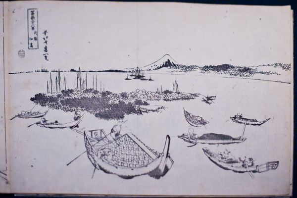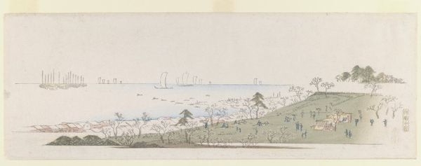 Curator: This print by Utagawa Hiroshige, titled "View of Gotenyama (and Shinagawa Bay)", depicts a serene landscape. The keyblock print offers a delicate monochrome palette. Editor: It's interesting to see the skeletal structures of trees and masts against the horizon. It feels so sparse and almost unsettling in its quietness. Curator: Hiroshige's use of the keyblock method is fascinating. It was primarily a guide for other colors, but here it stands alone, highlighting line and form. How accessible would these prints have been, given the paper and ink production of the era? Editor: Considering the growth of Edo as a commercial hub, such prints likely catered to a rising merchant class, keen on representing their connection to urban life. Curator: So, this delicate image also subtly speaks to economic shifts. It's more than just a pretty landscape, it is a commodity for a new type of consumer. Editor: Indeed, looking at it through that lens allows us to see how art becomes intertwined with social transformations.