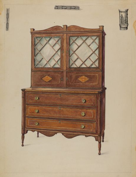 Curator: Editor: We’re looking at “Washstand,” a watercolor drawing of wood furniture made around 1936 by Nicholas Gorid. I'm struck by the drawing's almost clinical precision. The artist meticulously renders the wood grain. What aspects stand out to you? Curator: Well, initially, it’s a drawing of a cabinet that feels very tactile despite being a watercolor drawing. I’m really interested in how we understand drawings that represent utilitarian things, like furniture. What do you see in this piece? Curator: It seems worthwhile to begin by noting how this composition eschews any contextual environment. By setting the object alone in the pictorial space, the object, as pure form, takes center stage. Consider how this contributes to a viewing experience solely concerned with material and compositional choices. Editor: That’s interesting – that complete lack of context. I suppose that makes it less about the function of the object, and more about… itself. Do you think that reading applies to how the artist chose to represent it? Curator: Indeed. For example, the consistent and unwavering vertical lines of the wood grain provide a sense of structured visual movement. These regular lines also invite questions. Is the pattern a design choice or a necessary feature based on material requirements? It would seem crucial to continue to consider such details as key to deciphering artistic intention here. Editor: So, to look closely at the material properties is to move closer to grasping intent, I suppose? I can see how limiting context helps to focus attention on those details. Curator: Precisely. Attending to form and materiality will hopefully open channels towards understanding the intentions embedded within the construction of this piece. What might appear as simple utility perhaps houses deliberate considerations that challenge that very reading. Editor: Right. This has certainly altered my perspective. Thanks, that’s insightful.