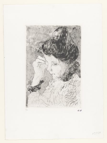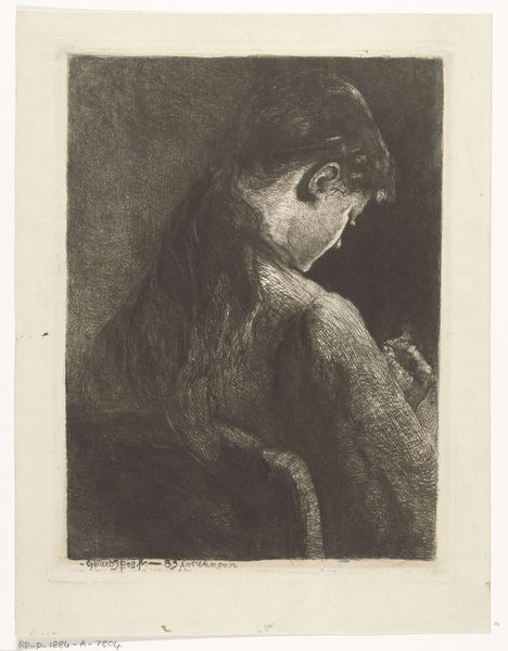 This drypoint print by Philip Zilcken captures a woman seen from behind, an intimate portrayal rendered with delicate lines. The bare back, a motif as old as art itself, immediately evokes vulnerability, but also a quiet strength. Consider how the depiction of the back appears throughout art history, from classical sculptures of Venus to the backs in paintings by Degas: a surface for projecting our emotions and desires. The exposed nape of the neck, in particular, has long held significance, symbolizing both eroticism and submission. Here, the woman's posture suggests introspection, her gaze turned inward. The very act of turning away invites speculation: What is she thinking? What is she feeling? This sense of mystery engages our subconscious, drawing on a collective memory of similar images across time. This artistic symbol resonates deeply within us, echoing through centuries of cultural expression.