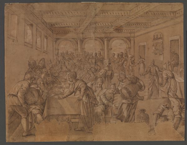 Felice Giani made this drawing, "The School of Rome," using pen and brown ink with brown wash on paper. These humble materials, common for sketching, are expertly handled to create a world of artistic activity. The drawing's sepia tones give a sense of depth and antiquity to the scene. You see the controlled lines of the pen creating forms, and the fluidity of the brown wash adding tonal variations. Giani applied diluted ink to build up shadow and volume. This material process allows the artist to capture both the architectural grandeur and the lively atmosphere of the academy. The artwork portrays a bustling studio filled with artists sketching classical sculptures, a practice integral to the training of artists in the Neoclassical period. The repetition of figures, each engaged in the act of creation, highlights the value placed on artistic labor and skill in 18th- and 19th-century Rome. It is a reminder that art, even when seemingly effortless, is rooted in dedication, hard work, and traditional craft.