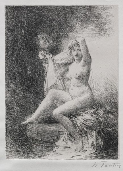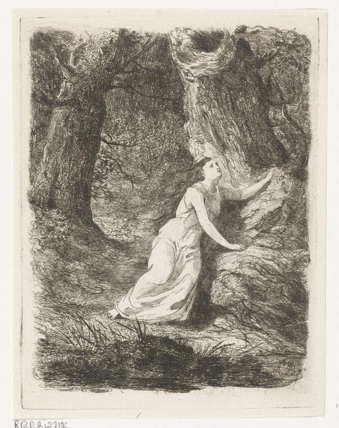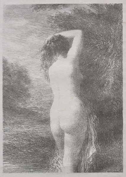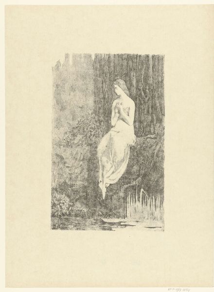Henri Fantin-Latour made 'The Beggar' with lithographic ink, and it feels like a dream caught in monochrome. Look at the way he layers those marks; it’s all about the process of building up tone and texture. I love the surface of this print, so velvety and soft, like a charcoal drawing but with the crispness of lithography. Notice the figure emerging from the darkness, her arms outstretched as if reaching for something just beyond grasp. The second figure in the bottom right is much fainter, like an after image. The stark contrast between the figures and the dense foliage evokes a sense of mystery, maybe even unease. This reminds me of Odilon Redon's ambiguous and dreamlike visions, where figures emerge from the shadows, inviting us to lose ourselves in the realm of the imagination. Ultimately, it's about embracing ambiguity and finding beauty in the unknown.