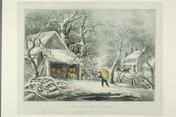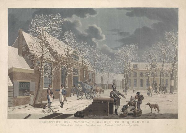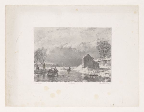 Paulus Lauters created this winter scene with pen and brush, using watercolour, around the mid-19th century. The composition is dominated by a large windmill and adjacent buildings, firmly rooted on the right, contrasting with the open, icy expanse to the left. The colour palette is subdued; muted greys, browns, and whites evoke the chill of winter. Lauters structures the scene using linear perspective, drawing the viewer's eye into the distance where human figures animate the frozen landscape. The windmill, a traditional symbol of Dutch identity, is not merely a picturesque element but a structural anchor. The building's cylindrical shape is a strong vertical which contrasts with the horizontal emphasis of the frozen landscape. The bare trees and overcast sky further emphasize the starkness of the season. The arrangement of elements suggests a dialogue between nature and culture. The rigid geometry of the built environment offsets the organic, irregular forms of nature. This interplay subtly challenges any romanticized view of landscape, reminding us that even in the quiet of winter, human intervention shapes our perception of the natural world.