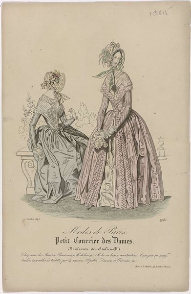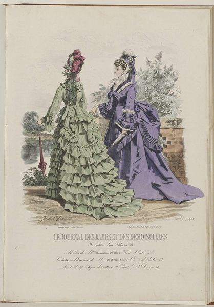 Editor: Here we have "Moniteur des Dames et des Demoiselles, ca. 1863, No. 670," an engraving by Laurent François Guerdet. The full skirts of these dresses seem so voluminous; they create such distinct shapes! How would you interpret the formal elements at play here? Curator: The pronounced emphasis on line is evident, delineating the figures and their elaborate costumes with precision. Note how the engraving technique produces a consistent texture, yet variations in line weight suggest depth and shadow. Consider, also, the deliberate arrangement of the two figures and the urn behind them. How does this positioning influence your perception? Editor: It almost seems like the figures mirror each other in their pose and create this implied line downwards to emphasize their dresses. The shapes and implied lines really dictate how one reads the picture plane. I also appreciate the pastel tones! It keeps the mind focused on the forms rather than being distracted by color contrast. Curator: Indeed. Further, analyze the strategic use of hatching and cross-hatching. Observe how these marks sculpt the forms, giving weight and dimension to the fabrics. The linear quality inherent in engraving elevates design over realism, contributing to a distinctly stylized effect. The engraving medium reinforces a sense of timelessness and artistic convention. Do you notice the specific ways in which these conventions create balance within the composition? Editor: Now that you point it out, there's something satisfying about the distribution of visual weight across the engraving. It all seems very intentional. Thanks for helping me really focus on the technique. Curator: My pleasure. Focusing on the material underpinnings reveals layers of meaning embedded within.
