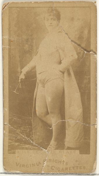 Editor: This is "Patsy Cardiff, from the Celebrities and Prizefighters series (N174) for Gypsy Queen Cigarettes," created sometime between 1887 and 1888 by Goodwin & Company. It's a print, a kind of promotional card. What I find most striking is the directness of his gaze. What stands out to you? Curator: That direct gaze is quite captivating, isn’t it? In these portraits, intended for mass consumption with cigarette purchases, we see a fascinating intersection of fame, masculinity, and consumer culture. How do you interpret the choice to depict Cardiff bare-chested? What symbols do you find beyond his face? Editor: Well, exposing the chest presents him as physically strong. In its time maybe, the bared chest indicated his role as a fighter and as the prize in boxing rings, rather than implying anything sexual. I wonder how viewers at the time would have responded differently. Curator: Precisely. Consider the context: late 19th-century America, a burgeoning industrial society seeking entertainment and heroes. Boxers were becoming increasingly popular figures. His slightly rumpled hair hints at the activity or labor he would be involved with as well. How did the association with "Gypsy Queen Cigarettes" shape the reception of his image and the idea of boxing in culture at that time? Editor: It seems like an effort to associate the sport with luxury or aspiration – making it attractive to a wider audience and kind of "glamorizing" him in the same way they advertise a product. It feels a bit exploitative now. Curator: It is layered in the way cultural narratives operate. Through such portraits, athletes like Patsy Cardiff transcend mere sport and are absorbed into a collective cultural memory that both immortalizes and perhaps simplifies them. Thank you for unpacking the complexity of his symbolism. Editor: Thank you! Thinking about that deeper cultural context has totally shifted my perspective on something I initially just saw as a straightforward portrait.