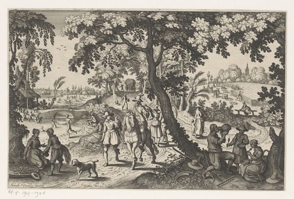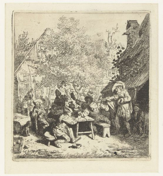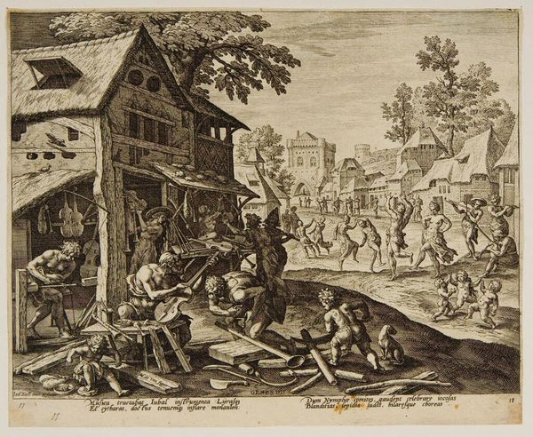 Curator: This ink drawing, dating from 1693, is entitled "An Itinerant Peddler in a Village," and it's the work of Cornelis Dusart. The composition, while dynamic, gives me an impression of organized chaos. The monochromatic rendering makes it slightly unsettling; everything appears flattened. Editor: Yes, there's a frenetic energy here, isn't there? So much clamor and merriment erupting all at once. Notice how Dusart utilizes the figure of the peddler not just as a central element, but almost as a cultural lightning rod around which village life seems to pulse and swirl. Curator: I see the structure functioning on multiple levels. On the one hand, we have the detailed rendering of forms suggesting an almost baroque fullness, particularly in the peddler’s immediate surroundings, contrasted with the thinner application further in the background, emphasizing spatial recession, giving this composition depth despite the two-dimensional flatness. Editor: Indeed. Think of the peddler and his wares--a fascinating blend of the sacred and the profane. I see what seems to be a statuette or effigy hoisted aloft, while the other objects could range from domestic tools to toys. It represents commerce but is tied into something deeper: the human desire for the talismanic object, a physical symbol of hope, fortune, or identity. It ties deeply into their cultural belief systems. Curator: That's astute. The convergence of detail versus the more diffuse applications further into the scene also creates a symbolic contrast between individual action and collective experience. This reminds the viewer that we must look beyond the action taking place with the figures in the center to view the town. Editor: Also note the dog, running ahead and unburdened; such creatures have long served as symbols of guidance. Notice, also, the somewhat jeering faces emerging from the architecture-- perhaps suspicion about newcomers. The narrative teems with human character types, all caught up in this everyday theater of survival and commerce. Curator: Yes, but beyond mere storytelling, it’s in the skillful articulation of volume through limited tonal variation. It exemplifies that in Dutch Golden Age art even common narratives can hold great artistic refinement, particularly within a deliberately chosen compositional structure. Editor: Absolutely. It is one thing to note its composition, and another to reflect on this art's value as a cultural repository of a community's fears and desires. An exquisite time capsule if ever I saw one.