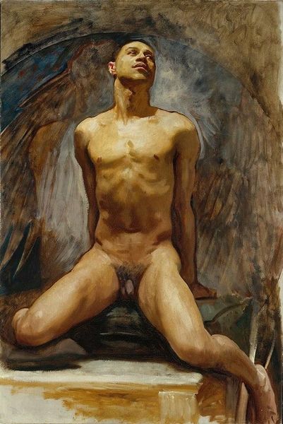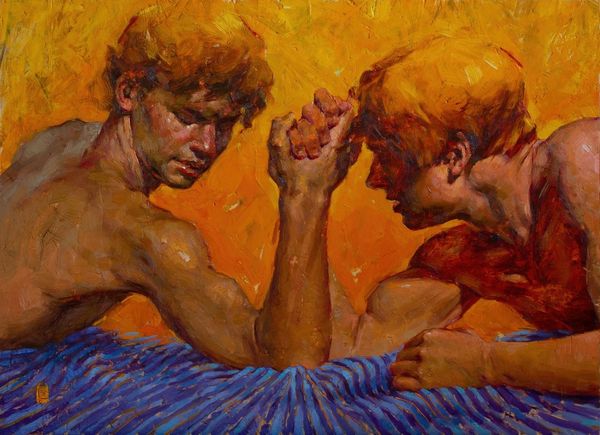 Editor: Here we have "There Will Be No White Flag Above My Head" by Tania Rivilis, crafted using oil paint. The figure's pose is striking, a kind of defiant pride seems to emanate from him. What do you see when you look at this piece? Curator: Initially, the vibrant and somewhat clashing colors attract the eye. Observe the juxtaposition of the warm oranges and yellows against the cool purples and blues. It's an interesting tension that immediately establishes a sense of unease. Editor: It's quite dramatic, isn't it? Almost theatrical with that striking color contrast. Curator: Precisely. Note how the artist uses distinct brushstrokes to define form and texture. Look at the musculature of the figure, sculpted with visible, almost sculptural strokes. Do you see how the flag behind the figure echoes this dynamism? Editor: Yes, now I see the parallel. So the flag, though a symbol, is more about texture than… symbolism? Curator: Its formal characteristics certainly demand consideration. Is the patterning purely aesthetic? Consider how it interacts with the figure, creating a visually stimulating – and potentially disruptive – backdrop. This adds another layer to our understanding. The relationship between foreground and background elements cannot be ignored. Editor: That's interesting – focusing on that interplay has really shifted my perception. Thanks for pointing that out. Curator: Indeed, by analyzing such internal relationships, we come to recognize that even the absence of an explicit narrative contributes significantly to the artwork’s expressive power. Editor: This was very informative. The focus on composition gave me a new perspective to appreciating art.