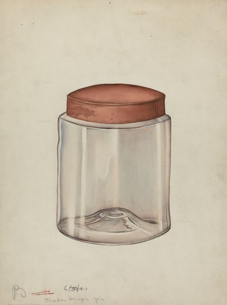 Curator: This is Charles Goodwin’s “Shaker Sugar Jar,” painted in 1941 using watercolor. It’s an unassuming image at first glance. Editor: Yet there’s a stillness, a certain austerity that captivates. The light plays subtly on the glass, hinting at its contours, but it refrains from any dramatic effect. It has such incredible clarity. Curator: Goodwin’s approach embodies a realism reflecting its time and subject matter. It appears to have been meticulously documented during the New Deal era when documenting items from everyday American life was the norm, think Depression-era FSA photography. The simplicity and utilitarian design connects to the Shaker emphasis on function over elaborate decoration. Editor: The transparent medium reflects a certain degree of openness, and that subdued, terracotta-esque hue of the lid sits in such pleasant harmony with the transparency of the jar. Look how it subtly picks up light; it's very gently glazed with watercolor. I think it reflects their value of craftsmanship. Curator: Absolutely. The visual clarity speaks to the societal need for functionality and a renewed sense of the straightforward during difficult economic circumstances. The Shakers also represented an alternative social structure that still held fascination in the American imagination at that point. This piece becomes an intriguing commentary on communal living. Editor: The subject is devoid of ornamentation. It makes it somehow incredibly pure. This object transcends being just a mere vessel; its form and its portrayal through watercolor gives the piece almost sacred weight, reflecting on simplicity. Curator: In some sense, this "Shaker Sugar Jar" becomes more than just an item; it encapsulates a cultural philosophy, even with so few aesthetic devices being deployed to deliver its message. Its humble and utilitarian shape reflects ideals about equality and communal endeavor which still hold relevancy today. Editor: This discussion of its purity makes you consider our material consumption and whether a simpler path toward life might give more. That simplicity and clarity of form does indeed hold lessons even now.