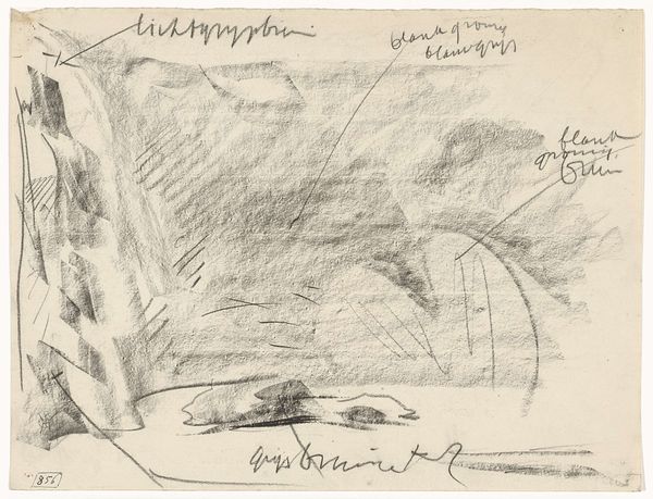 Editor: We're looking at "Gezicht in de duinen, met kleurnotities," or "View in the Dunes, with Color Notes," a pencil drawing by Gerrit Willem Dijsselhof, sometime between 1876 and 1924. It has an airy, almost frantic quality to it, like a quickly captured impression. What catches your eye, or how do you interpret this work? Curator: Immediately, I’m struck by how this drawing serves as a document of its time. While appearing to be just a landscape sketch, its impressionistic style reflects a shift in artistic focus during the late 19th and early 20th centuries. Artists began to value personal sensory experiences, like quick sketches done en plein air, more than polished studio paintings. Note how the "color notes" written by the artist served the artist in capturing color as accurately as possible for a studio rendering at a later time. Editor: That's interesting. So, the sketch isn't just about capturing the scene but also about recording information for a future painting? Curator: Exactly. It highlights a changing relationship between the artist, nature, and the artwork itself. This drawing reveals the increasing influence of scientific thought on art, where direct observation and documentation become paramount. Editor: I hadn't considered the influence of scientific thought. How did institutions play a role in promoting this type of artwork? Curator: Institutions like the Rijksmuseum, where this piece resides, played a significant role in legitimizing these styles of art, validating the importance of the fleeting moment and the artist's personal vision. By collecting and exhibiting these pieces, museums shape public perception and reinforce their cultural value. Editor: So, the museum isn't just a space for finished masterpieces but also for sketches that show the artistic process. Curator: Precisely. It democratizes the notion of art by showing the artist's methodology and preliminary observations. Editor: I guess it changes the way you look at these kinds of sketches, understanding their historical context and purpose beyond the initial impression. Curator: It demonstrates how art can act as both a mirror to and a record of socio-cultural changes.