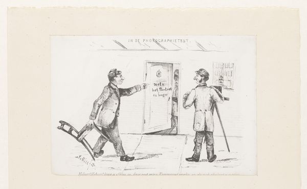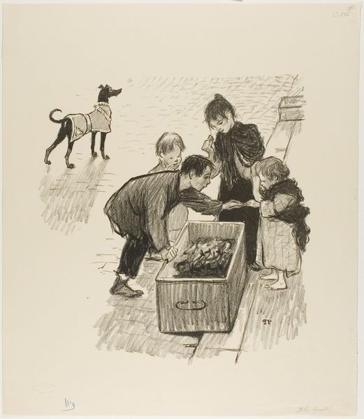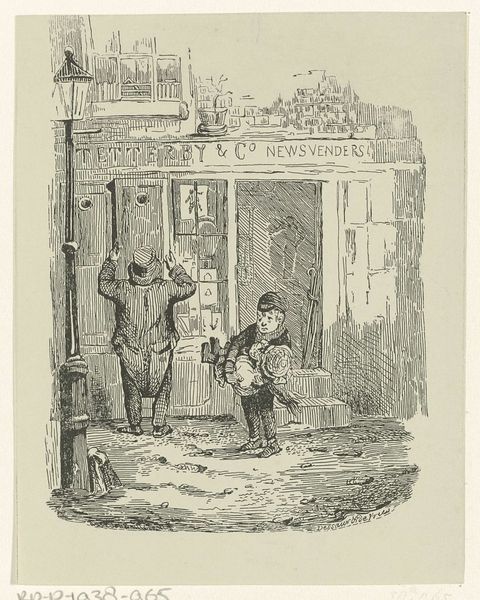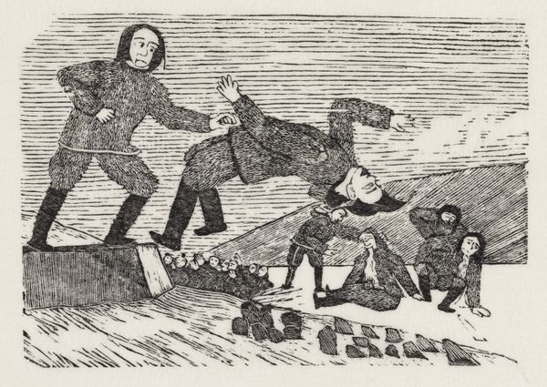 This is H.P. Hansen's "Proof Print for Chr. Winthers A.B.C.", made using engraving. What strikes you first is likely the stark contrast between the figures and the backdrop, achieved through precise and delicate lines. The composition is divided into clear zones: the detailed depiction of the two boys in the foreground and the hatched fence in the background. One boy sits passively, holding the string, while the other stands with the whip raised, suggesting a dynamic energy that contrasts with his friend's calm. The texture is created by densely packed lines in the clothing and background, giving the print a tactile quality. The print also hints at the values placed on activity and education in 19th century Denmark. Note the schoolbag discarded on the ground to make time for play. Hansen uses the formal properties of line and space to engage with broader cultural themes. This work is a testament to how the visual elements of art can enrich our understanding of history and culture.