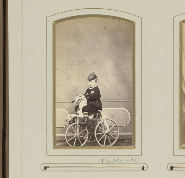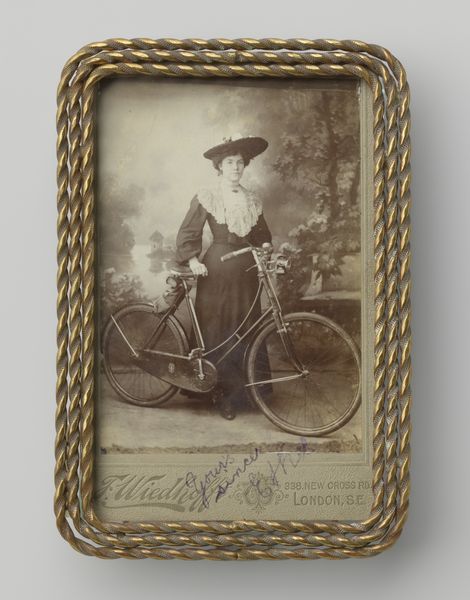 This mounted photograph, "Portret van een jongen op een fiets," by Walter Martin, offers us a glimpse into a bygone era. The sepia tones speak to the materiality of early photographic processes, where light-sensitive chemicals reacted with paper to capture an image. This wasn't just art; it was science and craft intertwined. Consider the alchemical labor involved, the careful balancing of ingredients and exposure times. The bicycle itself is a testament to industrial progress, a manufactured object representing freedom and mobility. Note the boy’s posture, a mixture of pride and self-consciousness, perhaps reflecting the social status associated with owning such a modern contraption. Photography democratized portraiture, but bicycles, like cameras, remained a privilege. Looking at this piece, we're reminded that art isn't just about aesthetics; it's about the social and technological forces that shape our world, captured in a single, carefully crafted image.