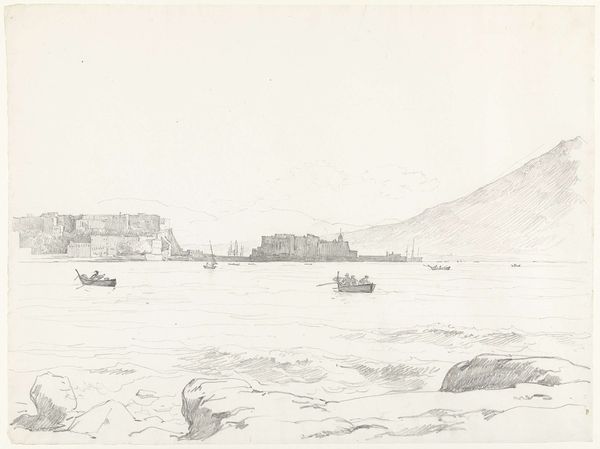 Editor: This is "Mountainous Landscape with a Village on the Rhine," a pencil drawing by Johannes Tavenraat, from around 1840. I'm really struck by how the imposing mountain looms over the tiny village. What do you see in this piece? Curator: I see a meditation on scale, a very Romantic concept. The mountain, rendered almost ethereally, represents nature’s enduring power. Notice how it's drawn with very light, almost hesitant lines compared to the village. What does that contrast suggest to you? Editor: Maybe a contrast between the fleeting nature of human existence compared to the permanence of the natural world? Curator: Precisely! And consider the Rhine itself, often a border and a conduit. Here, it separates us from the village. What is it separating? Is it merely geographical? Could it represent something psychological? Consider how Romanticism emphasized the individual’s emotional experience of the world. What emotions does this image evoke in *you*? Editor: There’s a sense of solitude, maybe even vulnerability, despite the presence of the village. Curator: Exactly. Tavenraat isn't simply drawing a landscape, he’s crafting a visual poem about the human condition. Editor: I see it differently now. It's not just a pretty picture. It really uses the symbols of nature and civilization. Curator: It's a landscape imbued with layered meaning, reflecting the complex emotional and intellectual currents of its time.