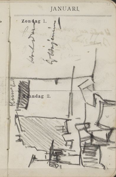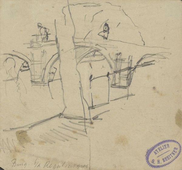 Editor: This sketch by George Hendrik Breitner, made between 1912 and 1919, depicts building advertisements, potentially on the Beursstraat or Damrak in Amsterdam. The use of ink on paper lends it an immediate, almost journalistic feel. What do you see in this work? Curator: The linear quality is striking; observe how the rapid strokes of ink define the architectural forms. Breitner seems less concerned with representational accuracy than with capturing the essential structure of these urban facades. Notice the interplay between the denser areas of cross-hatching, used to suggest depth, and the stark white space of the paper, which contributes to a sense of dynamism. Editor: It almost feels like a blueprint because of that. Curator: Indeed. The formal arrangement, however, does more than merely document. The layering of signs, and the ambiguous angles, disrupts the notion of a singular perspective. Instead, he offers a composition in planar recession, flattening perspectival space. Note also, the surface tension inherent in the lines and blank paper. Do you notice that too? Editor: Absolutely. So the meaning comes not only from what is shown, but how it's visually structured on the page itself? Curator: Precisely. By analyzing its composition, one discovers the artistic gesture and creative intention behind the sketched notations. Breitner’s artistic choice reflects how the subjective act of sketching creates an intriguing play of formal and linear relationships. Editor: This piece makes me see that sketches can have more significance if one studies their underlying structure, it's inspiring to go beyond simple observation. Curator: Yes, Breitner masterfully transformed seemingly random city advertisements into complex systems of visual expression.