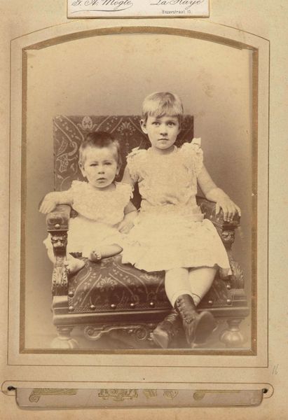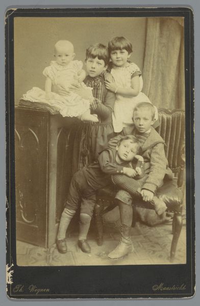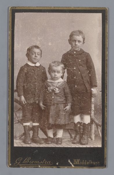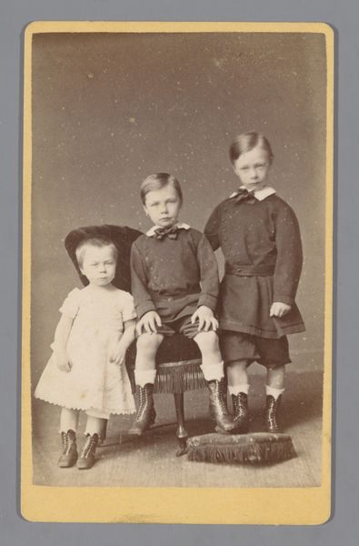 Curator: Here we have an intriguing photographic print entitled "Portret van twee meisjes en een jongen", or "Portrait of Two Girls and a Boy," attributed to Jacob Kuyper and dating roughly from 1880 to 1900. Editor: What strikes me immediately is the almost stark stillness, and how formally these children are presented. There’s a sobriety that’s quite touching, heightened by the limited tonal range. Curator: It's fascinating to consider the socio-economic implications of commissioning such a portrait during this era. This type of image would have likely been relatively costly and served as a potent display of bourgeois status and aspirations, wouldn't you agree? The children's clothing, too, is definitely saying something about who their parents wanted to be seen as. Editor: Absolutely. Note how the photograph as an object also reflects the prevailing aesthetics. The choice of photographic paper, the sepia toning, and even the studio backdrop, speak to a certain deliberate construction of image and material. The young boy is in that charming little sailor's suit. Was that a popular commodity for children? Curator: Precisely. The sailor suit became extremely popular due to Royal patronage but became widespread across many different levels of society at that time. The materiality extends beyond the subject matter; the print itself carries cultural significance as a crafted object intended for display and perhaps inheritance. We must also look at the availability of these textiles for lower socio economic communities too, to look at mass consumption across late 19th century cultures. Editor: And the studio's role, too. To what extent did the photographer shape the narrative presented to the viewer, particularly about ideas of ideal childhood and the value of family unity in that period? Curator: Precisely. Photographers like Kuyper would have certainly played a significant role in disseminating these notions of ideal bourgeois family life, reinforcing certain values and expectations within society through mass consumer imagery. Editor: Thinking about the children in this portrait, their serious expressions make me wonder about their experiences. Photography became more commonplace but the poses remain pretty rigid, what were the studio conditions at the time and how might the photograph allude to class consciousness and consumer behaviours of the era. It makes you really think about how things might have been behind that veil. Curator: It offers a valuable perspective on 19th-century social dynamics, the evolution of portraiture, and its profound implications for class and family life. Thank you for sharing this moment in time with us.