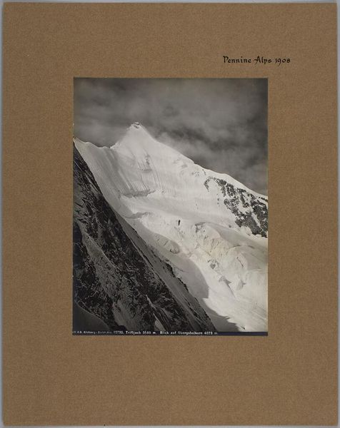 Curator: This silver gelatin print captures the Bernese Oberland, specifically From the Fiescherhorn showing the Schreckhorn and Lauteraarhorn. Editor: It feels ancient, almost like a memory surfacing—the stark peaks and glacial valleys speak of time immemorial. A visual echo of nature's power. Curator: The mountainscape, a study in light and shadow, is powerful—mountains, since antiquity, have been the symbol of permanence and the connection between heaven and earth. Editor: Absolutely. Those jagged peaks seem to pierce the sky, almost daring the viewer to contemplate mortality. I'm also curious what it would feel like to be there. Curator: Indeed, that might be what the artist, George Perry Ashley Abraham, wanted to convey. The sublime feeling of standing in the face of something so much bigger than ourselves. Editor: Well, he succeeded. This image captures the haunting beauty and fragility of the landscape—a reminder of what we stand to lose. Curator: It's a landscape of grandeur, indeed. Editor: It certainly is, and I think I will carry this feeling with me for a while.