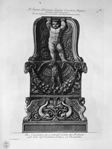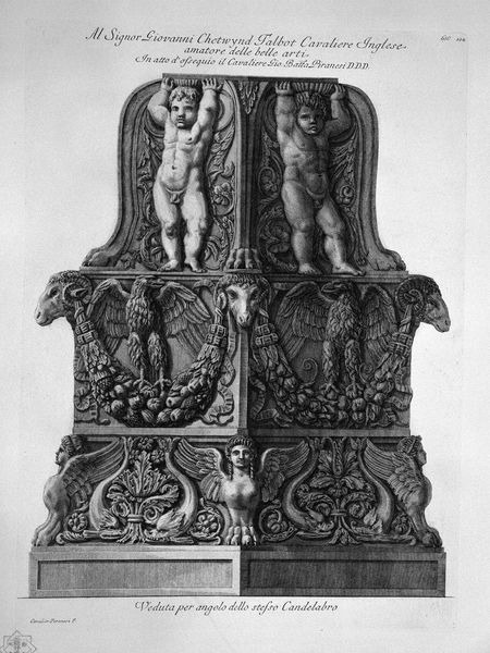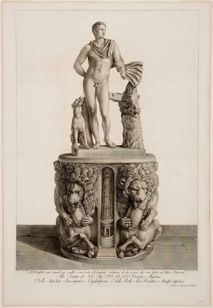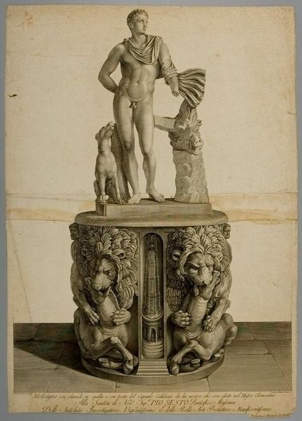 Curator: This engraving, simply titled "Meleager", is by Giovanni Battista Piranesi. Note the neoclassical lines in the sculpture's depiction. Editor: It's stark, isn’t it? The engraving highlights the strong lines of the statue but it also emphasizes a sense of isolation, a kind of cold grandeur. The stark black and white aesthetic adds to the sense of historical distance, too. Curator: Precisely. Piranesi was fascinated by the visual weight of Rome, the authority and history literally carved into stone. He made many engravings of sculptures like this one as a means of historical record but also to project that authority forward into his own time. Editor: And it definitely succeeds. Look at the almost aggressive masculinity embodied by Meleager. His stance, the details of his physique, it’s a very particular statement about power and ideal form that is reflective of certain social standards and political hierarchies. Is the hunting dog meant to represent the loyalty or control, perhaps both? Curator: Absolutely. Context is key. We have to understand the importance of antiquity to eighteenth-century political thought and social structures. Depictions of figures like Meleager reinforced ideas of heroic leadership, ideals tied to the burgeoning nation-states of Europe. The references to classical ideals helped in legitimizing the authority of patrons like Pope Pius VI, to whom it is dedicated. Editor: It also prompts questions about who has historically had access to these images and who has been excluded. These sculptures were not always neutral aesthetic objects; they carried coded messages. The racial and gender implications are, of course, things we really need to address critically. Curator: Right. The choice to celebrate specific moments from the ancient world or replicate only certain works reinforces biases of taste, creating a narrow view of art history, and perpetuating, in many ways, a cultural hierarchy. Editor: Reflecting on this image allows us to recognize the ways historical and social forces impacted art production, and continue to reverberate today. Curator: It's a poignant reminder of art’s powerful function and influence within a historical framework.