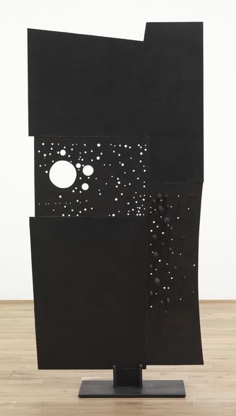 Editor: Here we have Funasaka Yoshisuke’s “Four Seasons of Lemon - Winter” from 1973, a print that juxtaposes playful, almost cartoonish lemons with stark, dark vertical lines. I find it strangely melancholic. What do you see in this piece, particularly with its symbolic weight? Curator: I see a potent blend of cultural memory and individual experience. Consider the lemons: universally, they might signify zest and vibrancy, but paired with those somber vertical lines, resembling bare trees, their meaning shifts. Could they be a stubborn holdout of warmth against the encroaching cold? Editor: That's interesting. The way you phrase it, that contrast evokes a kind of tension... is it a common technique to load images with double meanings in order to cause a disruption? Curator: Absolutely. Disruption, juxtaposition - these are tools artists use to force us to reconsider familiar symbols. In Japan, where seasonal changes carry significant cultural weight, representing winter with both barrenness and a hint of summer’s fruit complicates a straightforward narrative. What is “winter” if it includes “lemon?” Does this cause disruption in your personal expectations, also? Editor: Definitely! The lemons disrupt the winter scene, like you said. But is that colourful band on the side a reference to something, as well? It reminds me of springtime growth and abundance... Curator: Precisely! It's a fragmented landscape—a memento of brighter days against the muted palette of winter. The artist layers time itself into the image, reflecting on memory, longing, and the cyclical nature of life. The print invites reflection. What might endure? What will pass? Editor: That's a really fascinating way to look at it – seeing time itself layered within the piece and these small tokens being loaded with the history of culture! I'll certainly think about that when I see other works of art.