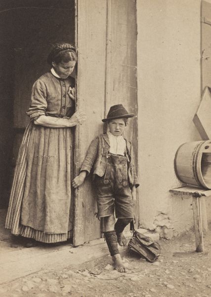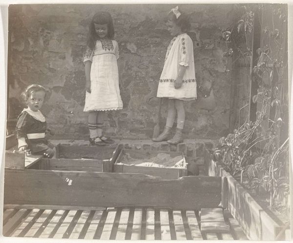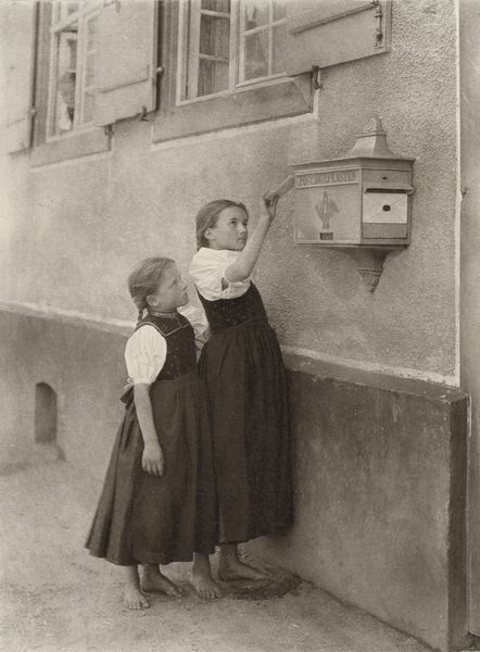 Richard Tepe made this photograph of a woman and three children in Bunschoten-Spakenburg traditional costume using a dry-plate process, but it’s more than just a documentation of a cultural moment. The sepia tone, that warm, earthy brown, gives the whole scene a timeless quality. I’m drawn to the way the light falls on the brick wall to the right, creating a kind of rough texture that contrasts with the smoother surfaces of the wooden door and the children’s clothing. It’s funny how the tones all merge, almost like a painting, blending the figures with the background and flattening the image slightly. The way the children are arranged, almost posed, reminds me of August Sander's portraits. There’s a similar interest in documenting types, but here it’s filtered through Tepe's own lens. It makes you think about how we look at each other and how we try to freeze moments in time.