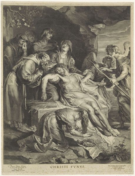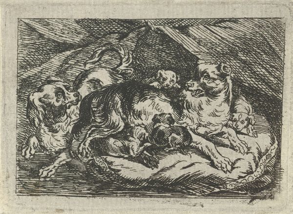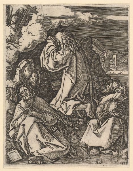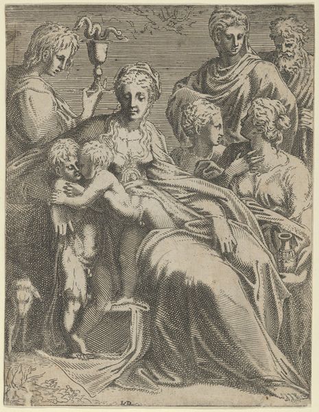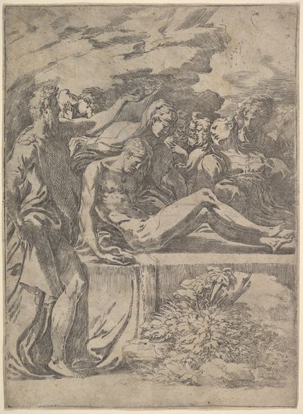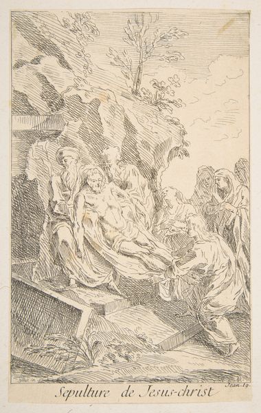 This is an anonymous etching of the Nativity, rendered on a small sheet. The composition is a densely packed arrangement of figures. We see them huddled together, their forms defined by a network of fine, closely-hatched lines. The stark contrast of light and shadow evokes a dramatic intensity. There is an almost claustrophobic feel. The figures are illuminated from an unseen source, heightening the emotional impact of the scene. The formal properties of the work point to underlying theological interpretations. The density of the etching lines and the compressed space speak to the earthly confines of the Nativity. In contrast, the illuminated figures represent the divine presence entering this world. The use of hatching creates a visual language that articulates the sacred narrative through artistic form. This print invites us to contemplate how an artist uses structure, form and composition to communicate profound religious themes.