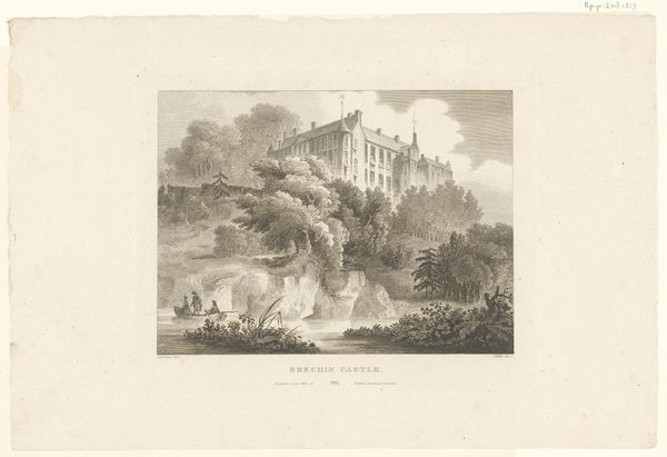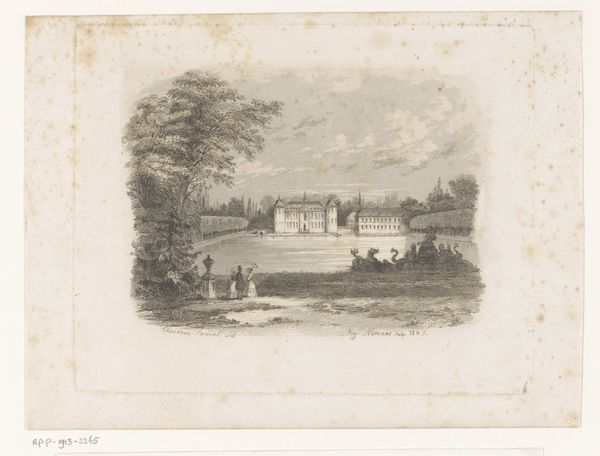 Curator: Here we have "View of the Thames at Night," an engraving by Carel Christiaan Antony Last, likely created sometime between 1842 and 1887. Editor: It's beautiful, yet unsettling. The moon seems to cast a pallid light. It highlights the grand house on the riverbank but also makes it look…lonely. Curator: Romanticism loved to explore those contrasts. Notice the composition. The eye is led across the water, the silhouetted figures in the boat, right toward the looming architecture and shadowy trees. Editor: Right, and the symbolic weight that the grand estates of the English aristocracy held in this period—signs of power and wealth reflected in popular imagery. Curator: Absolutely. It captures a kind of ideal, even with its shadows. The Thames itself becomes almost mythic, a stage for quiet human dramas. Note the swans gliding on the water and the two figures rowing along a lake—both serve as motifs for elegance and natural grace. Editor: And is the Thames, for Last, a symbol of a nation, of empire perhaps? The constant current suggests enduring power and an eternal flow of goods, people, ideas. Curator: The darkness adds an element of the sublime. We understand this ‘grandeur’ on an emotional level precisely *because* we’re aware of how easily it might be disrupted or vanish in the gloom. Editor: The use of black and white here is superb in emphasizing a psychological complexity. A world of privilege rendered eerie, haunted almost. It invites you to contemplate something lurking just beyond sight. Curator: Indeed. The architecture could represent the weight of tradition itself. Ultimately, though, it remains ambiguous—allowing us to bring our own readings of status and history. Editor: For me, I am moved by the silent river, its quietness broken only by the oars, under the gaze of a house lit up as though awaiting someone special. Thanks for clarifying that a bit! Curator: My pleasure. I'm reminded that prints like these were important disseminators of ideals about place and national identity. And to examine those ideals from our present moment always remains essential.