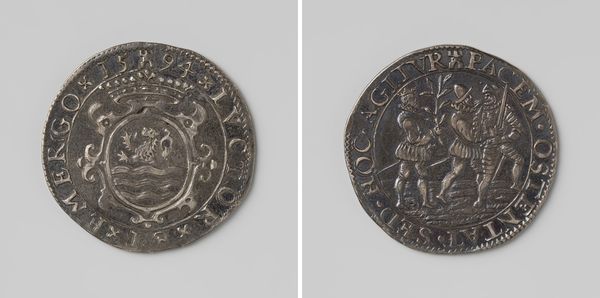 Editor: Here we have a silver print from 1596 titled "Wreck of the Spanish Fleet at Cape Finisterre," made by Gerard van Bylaer. I find the depiction of the shipwreck quite powerful for such a small, functional object. What stands out to you about it? Curator: For me, it's all about understanding the labor and the raw material. Silver, likely mined under harsh conditions, is transformed through engraving, a process requiring immense skill and time. How does the act of mass production, facilitated by printmaking, interact with the inherent value placed on the material itself, silver? Is this art, currency, a commemorative object, or all three intertwined by economic imperatives? Editor: That's fascinating. I hadn't thought about the mining of the silver itself. Does the choice of silver contribute to its meaning in the context of this historical event? Curator: Absolutely. Consider the symbolic weight of silver in the 16th century. It’s not just a pretty metal, it’s tied to wealth, trade, and power – often obtained through colonial exploitation. The wreck of the Spanish fleet, etched onto this silver surface, is therefore not only a historical depiction but a material assertion of Dutch maritime power, literally stamped into the spoils of war. Who produced this and how was the labor distributed to accomplish it? How would this object then be used and valued? Editor: So, the materiality and means of production elevate the artwork to something more than just an image? Curator: Exactly. By focusing on the process, the materials, and the economic context, we can challenge the idea of art as something separate from labor, consumption, and social power dynamics. Editor: I see the piece differently now, realizing its intertwined connection between artistry, commerce, and historical narrative. Thanks for your insights! Curator: My pleasure. I think analyzing the materials opens a dialogue with history itself.