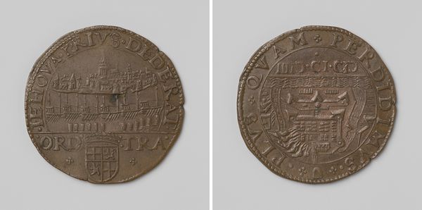 Curator: Today we're looking at "Maurits verhindert dat Mendoza bij Doesburg de IJssel oversteekt," or, "Maurice prevents Mendoza from crossing the IJssel at Doesburg," a relief carving dating from 1598. It’s made of metal and depicts a pivotal moment. My immediate response is how intricate and surprisingly dynamic the carving is. The detail crammed into this small, circular format is quite masterful. Editor: Intricate, certainly, but this dynamism speaks volumes about the propaganda and nationalist sentiment inherent to representing military victories during this era. This scene freezes a specific event within the larger context of Dutch resistance to Spanish rule, a very fraught historical landscape of oppression and revolution. Curator: Precisely. It’s a fascinating study in composition. One side presents Maurice thwarting Mendoza's crossing. The careful layering creates a sense of depth, even within the shallowness of the relief. We see the figures arranged spatially as well as hierarchically; I would point towards that lone, brave individual standing at the front of the scene repelling the masses with his weapon. Editor: Note, however, what such an overt visual statement elides; this carving offers an incomplete version of a much broader reality. Here the conflict becomes overly individualized in the figure of Maurits as it is divorced from the collective and structural problems facing this young country during wartime. These objects served less as documents of "history" than as artifacts promoting strategic narratives for both local and foreign viewership. Curator: But doesn’t this focus on a key turning point, the foiled river crossing, add impact? The artist uses such a high level of formal structure here, organizing narrative around that visual language to build up an extremely effective aesthetic that conveys victory to the audience through its use of dynamic figural positioning. Editor: And what vision of 'victory' is elevated, by what and for whom? These depictions and celebratory gestures mask the true costs and sacrifices during wartime for those most vulnerable. The visual spectacle, therefore, obscures systemic violence inherent in this representation of dominance and conquest. Curator: This pushes us to remember art never exists in a vacuum. What’s striking to me, though, is how effectively this metalwork uses its limited dimensions to suggest so much tumult. Editor: And its limited dimensions remind us it can't possibly contain the full truth. Its historical fingerprint is forever biased, reflecting specific power dynamics.