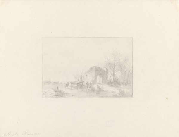 Editor: This is Arthur Evershed's "On the Banks of the Thames". It's an etching, and it feels very serene. What do you see in this piece? Curator: The Thames, over time, has symbolized both pastoral calm and bustling industry. Notice the flag. Does it evoke a sense of national pride, perhaps a yearning for simpler times before industrialization irrevocably altered the landscape? Editor: I hadn't considered that. The flag does give it a specific context. Curator: Exactly. How does the wheel’s stillness speak to you? Is it a relic of a bygone era, or a subtle reminder of the ceaseless flow of time and change? Editor: I see both, actually. It's like the past meeting the present. I've certainly learned a new way to look at it. Curator: And I'm reminded how potent simple scenes can be, carrying complex emotional and historical weight.