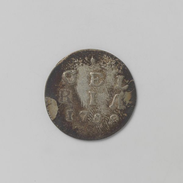 Curator: This is a “Duit van Groningen,” a coin minted in 1690 by the city of Groningen. Editor: Immediately, I’m struck by the patina. It feels like touching history itself – the wear and slight corrosion telling a silent story of countless transactions. It almost whispers. Curator: Absolutely, that tangible quality is central. These weren’t mass-produced in the way we think of currency today. The materials used and the methods to get those materials offer significant insight to economic situations. The process reflects labor structures and access to raw materials. What we see here are very local struggles made tangible. Editor: It’s incredible to consider what hands held this – shopkeepers, laborers, maybe even revolutionaries? There's an intimacy that contrasts with the grand heraldry it depicts – a crowned shield that appears strangely worn down with what seems to be the coat of arms. It seems the details were meticulously pressed into the metal, yet age gives the scene character and weight, the way history will always mark its truth, its cost, into our faces. Curator: That leads to another point of context about circulation—coins also served as political instruments. Designs asserted sovereignty. What was put into circulation reflects intentional political acts as part of power. How accessible coins are becomes part of who profits, of trade. In the context of the province in 1690 – this coin signifies their distinct identity during a politically complex period of Dutch history. Editor: The scale amplifies the impact. Thinking of this powerful imagery shrunk down – to fit in your palm – highlights its function: power reduced and multiplied, moving amongst the populace. Each transaction a subtle reminder and a link in the social and economic chain. I love how something so seemingly insignificant can hold so much meaning. Curator: That meaning is shaped, even imbued, through that production and usage. Understanding the history that lies beneath that "wear and tear" brings new insight into each interaction—how someone might obtain it or part with it reveals power and powerlessness. Editor: True. This little disc invites you to hold more than its monetary worth, inviting its past into present consideration. It sparks something human and communal, even from behind glass, to make a historical imprint.
