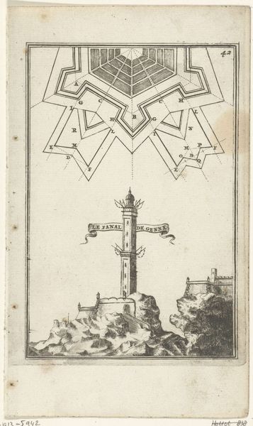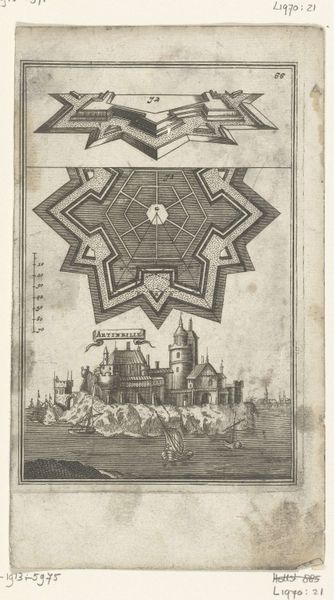 Romeyn de Hooghe etched this illustration for Allain Manesson Mallet's "Den Arbeid van Mars," capturing a Vauban-style fortress with its complex geometric fortifications. The star shape, dominating both the fort's layout and the superimposed diagram, speaks to more than mere military strategy; it echoes the 'star fort' design, prevalent since the Renaissance, a direct response to gunpowder weaponry. Consider how this geometric form – a symbol of protection and power – also resonates with ancient cosmologies. The star, a celestial guide, now manifests on earth as a bulwark against earthly threats. The emotional weight of such imagery is profound. These fortresses, with their imposing geometry, were not only physical defenses but also psychological tools, projecting strength and stability in an age of constant conflict. This etching is a testament to how human ingenuity, driven by fear and ambition, shapes not only landscapes but also the very symbols we use to define our world. The image of the fortress is one that will always stay with us, as it is constantly evolving, yet firmly rooted in the past.