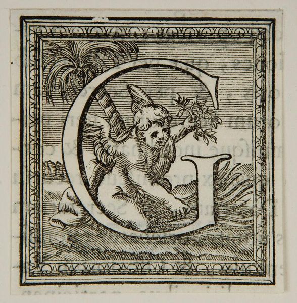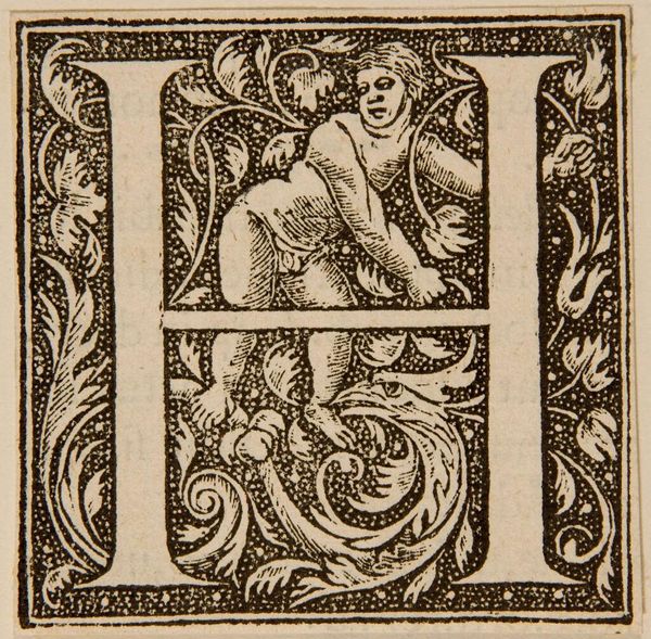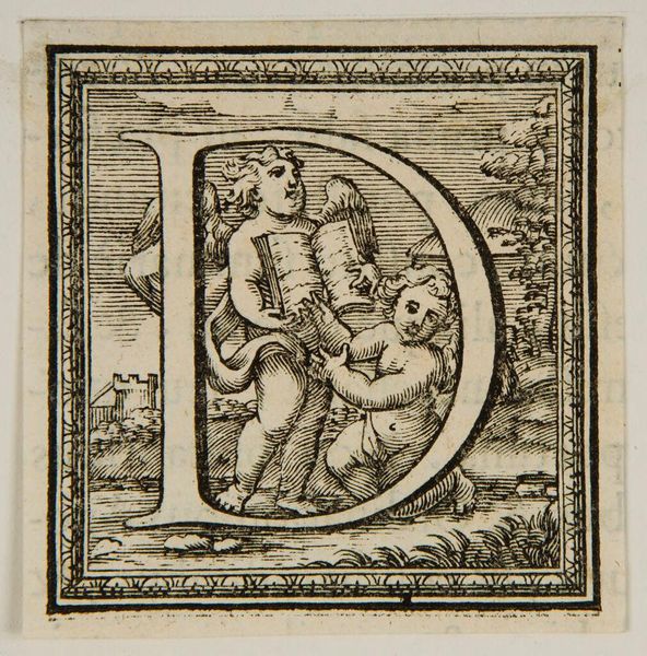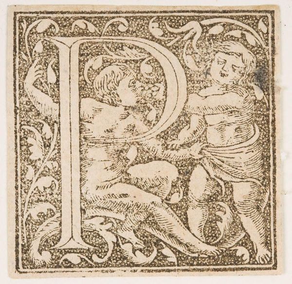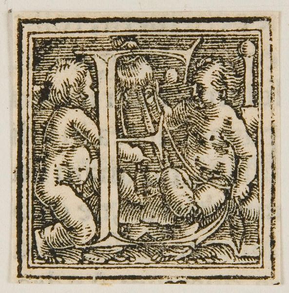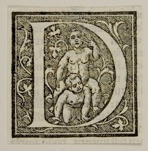 Curator: What strikes you immediately about this "Letter Q," by an anonymous artist? Editor: The graphic quality, the strong contrast of the line work. It feels both playful and precise. Curator: This letter Q, residing here at Harvard Art Museums, presents a fascinating study in form. Notice how the artist uses the shape of the Q to frame the figures. Editor: It looks like a depiction of instruction. What strikes me is the relationship between the figures, and the way they are intertwined with the letterform. Who were these images for? Curator: The piece could have been included in primers for young students. A sign of how cultural meaning is constructed. Editor: I agree, and its graphic simplicity makes it all the more compelling to me. Curator: A succinct yet evocative piece. Editor: Exactly.