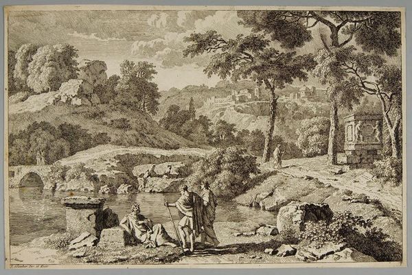 Curator: Let's turn our attention to Joseph Anton Koch's 1834 pen drawing, "Apollo Unter Den Hirten," which translates to Apollo among the Shepherds. Editor: It has a sort of melancholic harmony to it. The arrangement is careful, creating an interesting, albeit muted, dialogue between foreground and background elements. Curator: Indeed. Koch was deeply immersed in the classical tradition, but also influenced by Romantic ideals of landscape. Here we see him constructing an Arcadian vision. Editor: The inclusion of Apollo feels symbolic. Look at the groupings of figures around him—the emphasis is on a kind of peaceful existence, a utopian idea of humans living in accord with nature. Is Koch making some comment about the political environment? Curator: Koch spent much of his career in Rome, absorbing its classical heritage, but also witnessing political unrest. There’s certainly a longing here for an idealized past, a contrast to the turbulent realities of 19th-century Europe. Note the layering of light and shadow—it directs the viewer’s gaze, creating both depth and narrative tension. Editor: The contrast between the pastoral scene in the foreground and the almost militaristic line of figures receding into the distance on the hill, that has to be intentional, to heighten that tension, no? It could almost be an assertion of an escape into an idyllic mindset as opposed to political chaos. Curator: Precisely. He uses the landscape not merely as a backdrop but as an active participant in conveying meaning. We can view his aesthetic response as a commentary of those early years of 19th-century life and his personal and spiritual existence as it related to the state. Editor: I was immediately drawn to the scale of the trees; their arrangement seems very self-aware. As much as the figures, these create points of rhythm. And notice the absence of true darkness; it softens any potential drama, reinforcing that mood of quietude. Curator: A powerful summation, one that illuminates how the material choices and visual arrangements enhance the painting’s enduring themes of paradise found. Editor: I see now that in capturing this fleeting historical commentary, this piece serves as a reminder of art's power to both mirror and reshape our perceptions.