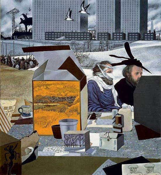 Curator: Ivan Eyre's "Verandah," painted in 1997, really throws a lot at you at once, doesn't it? It's this curious mix of the familiar and the utterly bizarre. Editor: That's an understatement. It’s like a stage set after the play has been abandoned. My first thought is... unsettling. Almost surreal. What are we even looking at? Curator: On the surface, we've got figures caught mid-action in what could be a dilapidated urban landscape or some sort of backstage area. Then there are the odd juxtapositions: the elegant woman in the blue dress seated next to... is that a television with a baby's face on the screen? Editor: And two naked figures up to their eyeballs in bandages as they meticulously cover the whole scene in white paint, as the buildings go on in their serene daily activity, quite unaware. Honestly, it feels like peering into a very odd dream, where realism is just a suggestion. Curator: The socio-political reading for me centres on that stark contrast between the chaotic interior, this artist’s studio, and the seemingly indifferent city skyline in the background. Perhaps Eyre is commenting on the role of art in society—does it mirror the world around us, critique it, or retreat from it? It is like they are creating art out of the city, which is now behind them... Editor: Retreat definitely comes to mind. The scene evokes the artist in their secluded universe, maybe a little crazy from what the public eye and its art expectations are. Painting away, unaware of the cold-hearted city out there, and seemingly immune. It's really powerful. I find it disturbing, but I can't look away. Curator: Agreed, and that unease is likely intentional. I read something where Eyre talks about exploring the spaces between the conscious and unconscious mind in his art, and that certainly rings true here. The city keeps rising anyway... and the babies on screens as well. Editor: It leaves me with a lingering sense of... longing, I think. Like a desire to somehow decode this complex puzzle and perhaps to get out there myself and build it. "Verandah" stays with you, doesn't it?