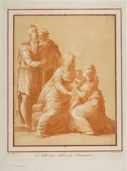 Editor: This is Arthur Pond's "Group of Figures," held at the Harvard Art Museums. It’s an intriguing drawing, the figures seem to be caught in a moment of intense conversation. What social dynamics do you see at play here? Curator: Considering Pond's era, the grouping could represent societal power structures. The male figure, perhaps a patriarch, engages with the female figures, while the child gestures towards him. Does this interaction hint at the limited agency women and children experienced? Editor: That’s a compelling point. So you see the positioning as indicative of a larger social hierarchy? Curator: Exactly. The gaze, the relative size, even the draping of fabric versus exposed bodies...they all contribute to a narrative of dominance and submission, reflective of 18th-century gender roles. Editor: It’s eye-opening to consider how even a seemingly simple composition can reveal such complex power dynamics. Curator: Art provides a lens to examine the social and political contexts that shaped it, and shapes us.