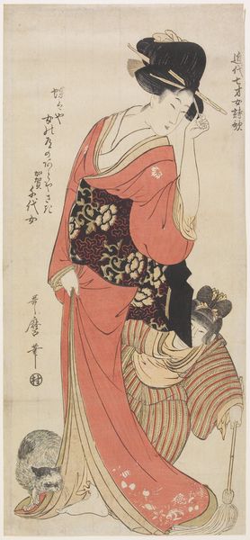 Curator: Standing before us, we have "Right - In the Style of an Actor," a woodcut print by Nishimura Shigenaga, created around 1730. What strikes you first about it? Editor: Honestly, the flamboyance. Look at the busy, theatrical patterning on the robes – it's almost dizzying! It feels like an intentional performance of status and role, even before considering it represents an actor. Curator: Precisely! The layering of visual information offers much more than simple representation. Look at how Shigenaga utilizes the graphic quality of the woodcut, not just to depict the actor's garment, but also to almost amplify their persona. Editor: It's a masterful use of pattern and line to convey something beyond the immediately visible. The flowing lines of the kimono create this cascade of images – musical instruments, geometric forms… it is like decoding a visual poem. It pulls you in to question all these layers that adorn the central figure. Curator: And the figure’s stylized pose contributes significantly. There is this exaggerated forward lean as though in mid-performance. It is such an elegant expression. And how about the considered, simplified face? There's almost a meditative calm juxtaposed with the dynamism of the clothing. Editor: Yes! And it highlights how Ukiyo-e prints walk that wonderful line between portraying popular culture—the actor, the theatre—and this deeply refined aesthetic sensibility. Curator: Ukiyo-e translates as "pictures of the floating world," doesn't it? It is just so wonderful how the style allows us to be transported to the energy of that theatre scene, centuries away. The print is not simply a portrayal; it feels more like an invocation, or a time portal that places us there, witnessing that spectacle. Editor: Absolutely, a snapshot of a fleeting moment, perfectly captured through the rich interplay of pattern, form, and historical context. Thanks, Shigenaga, for the invite. Curator: I concur entirely, truly a delightful glimpse into the past, through the artist's meticulous observations.