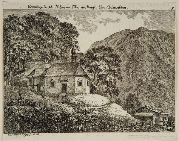 Editor: Here we have Johann Heinrich Meyer’s "Goldau," likely created sometime between 1680 and 1752, now residing in the Harvard Art Museums. I find the etching quite charming in its depiction of a small village. What resonates most with you when you view this piece? Curator: Notice how the church steeple is centered, almost piercing the sky. The church is a symbol of stability, but placed against such immense mountains, it suggests a negotiation between the earthly and the divine. Meyer seems to be asking, "Where does faith reside in the face of nature's grandeur?" Editor: That’s a compelling point. The landscape does dwarf the village. Curator: Indeed. How does the image speak to your understanding of humanity’s place within the larger world? Editor: It makes me consider the enduring power of nature versus our more ephemeral creations. Thanks for sharing this perspective! Curator: My pleasure. It’s always rewarding to unpack the layered meanings embedded in these seemingly simple scenes.
