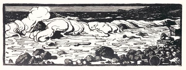 Curator: This is an illustration in ink on paper by Ivan Bilibin for Alexander Pushkin’s poem “The Tale of the Fisherman and the Fish”. Editor: What a wonderfully turbulent scene! All of those dark, energetic lines evoke such a strong feeling of anxiety. The rough texture of the waves, the wind lashing at the old man...it feels oppressive. Curator: Absolutely. Bilibin excelled at capturing the emotional tenor of folklore through carefully considered symbols. The sea, here, isn't just a body of water. Editor: More like a character in itself. Notice the weight of those inked lines – it’s almost woodcut-like in its density, and clearly crucial in creating this somber, tempestuous mood. Curator: Precisely. Think of the sea as embodying the unpredictable and often harsh forces of fate. It connects to a deep well of symbolic meaning linked with our unconscious fears. We return to the chaotic ocean throughout cultural history. Editor: It also highlights a certain simplicity in materials and production. Ink, paper, repeated lines… a stark contrast to, say, the opulent desires driving the fisherman's wife. You could argue the starkness underscores the raw deal the fisherman receives – or maybe, even implicates his own labor. Curator: Good point. One can look at it from a socio-political viewpoint but also delve into the universal motif of greed as destabilizing the natural order, which is symbolized here in the tumultuous waves. It really is striking. The entire scene is dominated by this churning visual texture. Editor: Which you wouldn't get without those carefully controlled lines and cross-hatching. What the fisherman hopes to gain through magic—and easy acquisition—ultimately demands a harder material reckoning, rendered painstakingly by the artist’s hand. A very telling parallel! Curator: Indeed. The use of recurring artistic vocabulary points back to tradition; Bilibin intentionally drew upon and reinforced cultural memories. And by doing that, it really serves the story. It's evocative of more than just a fable. Editor: Well, the means, the materials, the visual labor involved…all are inextricable from its broader cultural message, adding depth. A deceptively "simple" drawing holding profound insight, would you say? Curator: Couldn’t agree more. It speaks volumes, even without color.