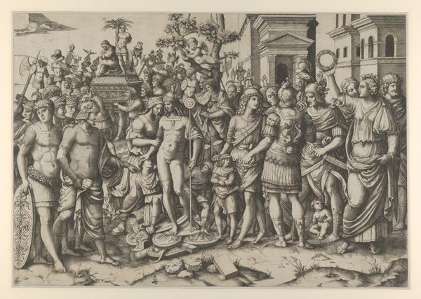 Antonio Fantuzzi created this print, "Scene from the Dacian Wars", sometime between 1537 and 1545. During this period, artists increasingly drew inspiration from ancient Roman military achievements, often reflecting contemporary political and military ambitions. Here, Fantuzzi depicts a chaotic battle scene, filled with Roman soldiers clashing violently with Dacian warriors. How does Fantuzzi use the visual language of conflict? Notice the artist's portrayal of the Roman soldiers as organized and disciplined, while the Dacians appear more savage and wild. This contrast reinforces a narrative of Roman superiority. The print also invites reflection on the human cost of war. The graphic depiction of violence, with bodies strewn across the battlefield, evokes a sense of horror and despair. Consider how Fantuzzi uses the scene to elicit an emotional response, compelling the viewer to confront the brutal realities of military conquest. The artist challenges us to engage with themes of power, conquest, and human suffering.