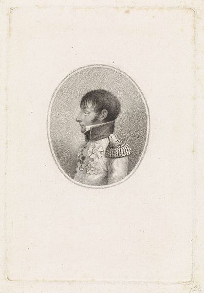 Editor: Here we have Jacob Willem Strunck's "Portrait of Louis Napoleon Bonaparte," made sometime between 1806 and 1810, an engraving. It's so detailed and precise, but also… a little stiff, don’t you think? What strikes you when you look at this? Curator: Stiff, perhaps! But portraits from this period, steeped in Neoclassicism, were all about projecting power and order, you see. Less about capturing a fleeting emotion, and more about immortalizing the sitter as a figure of authority. And Strunck really leans into that. What do you make of the circular frame and the stark profile view? Editor: I guess the circle gives it kind of a classical, coin-like feel? But it's also distancing. I'm more drawn to art that feels…personal. Curator: Personal, yes, but kings rarely strive for relatability! Look closely at the detailing on the uniform, though. The painstaking engraving really highlights the medals and epaulettes. Think of it as propaganda, carefully constructed to reinforce his legitimacy as King of Holland. The almost scientific precision is fascinating in itself. Editor: Propaganda, right! Like an official stamp. I still think it's kind of cold. Curator: Perhaps, but I see a dedicated craftsmanship. A skilled engraver interpreting a king who’s already interpreting himself for the public eye. Editor: So it's a performance, about a performance, by another performer… wow, it’s performances all the way down. Curator: Indeed! Next time you look at a portrait, especially from this era, ask yourself: What story is it trying to tell? And who’s pulling the strings? It opens up a whole new way of seeing. Editor: I get that. Thanks. Now I'm wondering what *Louis* thought about the final portrait, or whether he cared. Curator: Now *that's* a question worth pondering! The artist serves the sitter who serves his political image... circle closed, maybe?