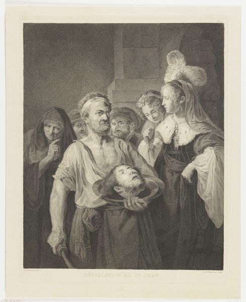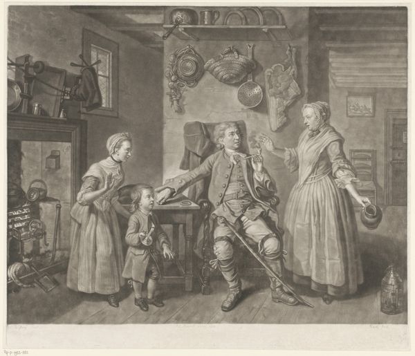 Jakob Matthias Schmutzer created this etching, "Interior with two couples eating at a table," using metal plates and acid. He would have coated the plate with wax, scratched away lines to create the image, and then dipped the plate in acid to bite the exposed metal. Look closely at the details Schmutzer captured. Notice the rendering of light and shadow, achieved through precise lines and cross-hatching. It is a labor-intensive process, demanding technical skill and patience. Yet, printmaking at this time was crucial to disseminating images widely. This was image-making in the service of a growing consumer culture. The scene depicts a domestic interior with figures eating and drinking. Everyday objects are visible, like the earthenware jug on the floor. Schmutzer's etching elevates a common scene into art, reflecting a growing interest in the lives of ordinary people. By focusing on these subjects, Schmutzer blurred the line between high art and the everyday, inviting viewers to appreciate the artistry inherent in the craft itself.