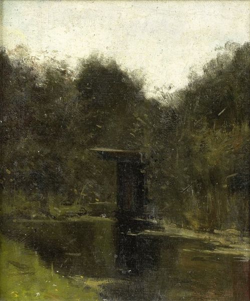 Curator: This is Vasily Polenov's "Pond," painted in 1879. It's an oil painting and hangs in the Tretyakov Gallery in Moscow. What strikes you about it initially? Editor: It's deeply immersive; a study in contrasts between light and shadow. A wooden footbridge beckons towards some unseen, sunlit space just beyond the dense foliage. A dark mirror reflecting hidden stories. Curator: Polenov painted this en plein air, so this interplay of light wasn't constructed in the studio, but observed directly in nature. That path beyond the footbridge suggests not just sunlight, but a kind of promised haven. Do you sense a tension between the realistic and the romantic? Editor: Absolutely. While Polenov commits to realism through his close attention to nature, there's still this lingering sense of romantic longing, of something just out of reach. Water, in itself, is often symbolic of the unconscious. It is almost an invitation to meditate on reflection and clarity. Curator: The landscape is not merely a backdrop. Rather, it embodies specific political sentiments. Consider the context of late 19th-century Russia: The painting evokes the yearning for peace and natural harmony in a society marked by growing industrialization and social unrest. It serves almost as a collective memory. Editor: So it acts as a kind of idyllic counterpoint? An idealized vision against a more turbulent reality? Do the water lilies hint at the spiritual? It almost takes me back to a pre-modern sense of place, something deeply connected to the soil. Curator: Exactly! These small details become loaded. The lilies, for instance, might suggest purity and tranquility—again, values in contrast to societal strife. His close attention to light emphasizes clarity, like a pathway towards awareness during a clouded era. Editor: Thinking about his choice of scene, it reminds us that even in what appears as quiet contemplation, nature reflects the inner psyche and historical currents that are never far removed. Curator: Indeed. And how artists like Polenov chose to portray their world reveals the era's hopes and anxieties, shaped by very concrete factors in social and political conditions. Editor: And understanding those conditions enriches our connection with the work. It reveals art to be more than an object of beauty, but rather a symbol of cultural memory and identity. Curator: It brings history to life, offering an intriguing view into the landscape and ourselves.
