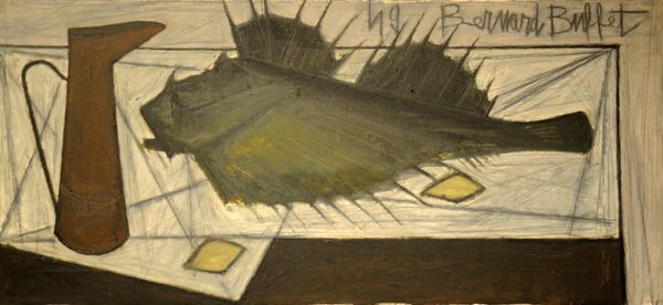 Christo Coetzee’s painting, Fish, presents us with a simple yet striking composition rendered in oil paint. A fish, displayed on a plate, confronts us directly, its form delineated with thick, textured brushstrokes. The palette is restrained, dominated by muted grays and yellows, creating a somber, almost melancholic mood. Coetzee's application of paint is particularly noteworthy. The impasto technique, where the paint is laid on thickly, gives the fish a palpable presence. This emphasis on materiality disrupts any sense of illusionism, reminding us that we are looking at paint on canvas, not a real fish. Furthermore, the structural arrangement within the painting invites semiotic interpretation. The fish, a symbol often associated with life and abundance, is here presented in a state of stillness. Ultimately, this painting is not just about representing a fish. It engages with broader artistic and philosophical concerns about representation, materiality, and the very act of seeing. By foregrounding the texture and form, Coetzee prompts us to reconsider our relationship with the object and the painting itself, challenging fixed meanings and encouraging new ways of thinking about perception.