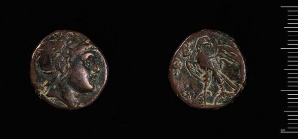 Curator: What a powerful little thing! I'm just struck by how much history is crammed into this tiny space. Editor: Indeed. This is a coin from the Koinon of Thessaly, a regional federation in ancient Greece. This little bronze disc, weighing just over eight grams, offers us a glimpse into their world. Curator: It looks so worn, feels almost… intimate, you know? Like I'm holding a memory. On one side, the head in profile, the other, what looks like a figure, perhaps a goddess? Editor: Quite right. The obverse likely depicts Zeus, and the reverse, probably Athena, the goddess of wisdom and warfare. Minting coins was a significant act, asserting political and economic control. Curator: Makes you wonder about the hands it passed through, the stories it could tell. Imagine holding the weight of a kingdom in your palm. Editor: Absolutely. And for museums, like the Harvard Art Museums where this coin resides, it symbolizes how objects connect us to broader social, political, and cultural narratives. Curator: A tiny portal to the past, whispering secrets only art can reveal. Editor: Precisely. Each coin, a small piece of a much larger, fascinating puzzle.