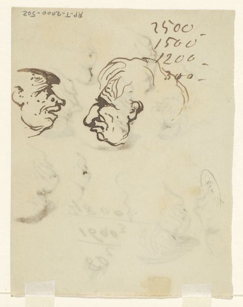 This is a study sheet with figures, made by Johannes Tavenraat, using pen and brown ink. The composition is dynamic, a collection of figures sketched with quick, expressive lines that capture a range of characters and expressions. Note how Tavenraat uses line weight to define forms, creating depth and shadow. The figures are rendered with a caricature-like quality, exaggerating features to convey personality and emotion. The overlay of text adds another layer, disrupting the figures while creating a sense of depth. This combination of text and image challenges fixed meanings and invites multiple interpretations. The handwritten notes can be seen as a reflection of the artist's thoughts. This creates a dialogue between the visual and textual, between the seen and the said. The artist blurs the line between observation and commentary, making this study a fascinating exploration of form, expression, and the interplay between different modes of representation.