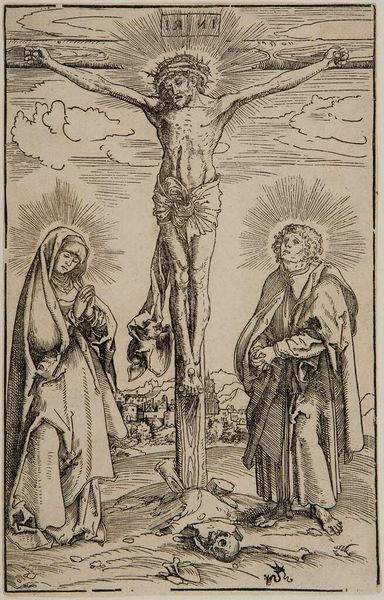 This is Boëtius Adamsz. Bolswert’s engraving, ‘Christ on the Cross, with Mary and St. Catherine.’ It strikes you with its stark contrast, an interplay of light and shadow achieved through fine, deliberate lines. The composition is divided vertically, mirroring the emotional states of the figures depicted. Bolswert employs a structured approach. Christ dominates the scene, affixed to the cross, his body illuminated. Mary Magdalene, kneeling, supports his feet. The figure of Saint Catherine is portrayed with an impassive stance. These elements create a visual hierarchy, directing the viewer's gaze. The artist uses light to emphasize Christ’s suffering, contrasting with the subdued grief of Mary. The engraving operates within a semiotic framework. The cross, halo, and sword serve as cultural codes, enhancing the symbolic weight of the depicted scene. This artwork reflects the broader philosophical concerns of the time. It prompts us to consider how art engages with profound themes of sacrifice, redemption, and human suffering.