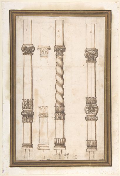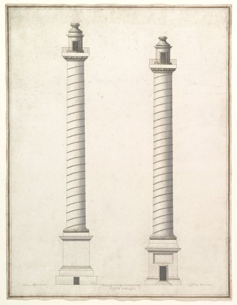 Editor: Here we have "Design of fireworks: two views of a rocket" from the period 1650 to 1750, currently housed in the Metropolitan Museum of Art. It seems to be rendered with watercolor and possibly pencil. The artwork is rather simple in its composition, mostly gray and brown colors. What aspects of its design and rendering do you find particularly striking? Curator: It's fascinating how the artist employed rudimentary techniques to depict form. Note the artist's mark making. Observe the deliberate choice of pale watercolour washes. It does little to convey any atmospheric effect. Note how the drawing is clinical. The application of washes appears as a structural element, defining the contours of the fireworks. Editor: So, you're saying the focus is on the shape and not any kind of emotion or realistic portrayal? Curator: Precisely. The success here lies in the construction of two discrete shapes. The lines themselves hold a unique position of importance as an individual component in this presentation. There’s an inherent rigidity in the work, and this rigidity speaks directly to the subject matter itself, does it not? Editor: I suppose it does! I see how the crisp lines and defined forms are essential in showcasing the actual firework construction. Curator: Absolutely. Without these qualities the objects become divorced from reality, or our expectations of it at least. It presents its argument through simple representation, prioritising its intrinsic visual language. Do you feel this understanding changes how you perceive it now? Editor: Definitely. I now see the artistic choices were specifically made to showcase the structure. Thanks! Curator: My pleasure. Paying close attention to materiality and structure unlocks new perspectives in any work of art.