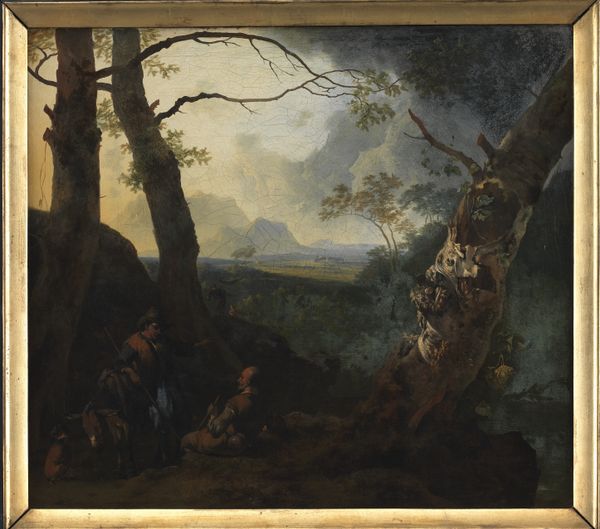 Curator: Here we have "Forest" by Simon de Vlieger, an oil on canvas that evokes the drama of nature. Editor: It’s heavy, brooding almost. The color palette is very subdued, with browns and greens dominating, which certainly reinforces a feeling of gravity. Curator: Absolutely. The structural use of light is fascinating. Notice how De Vlieger employs chiaroscuro to direct the viewer’s gaze, pulling you from the darker foreground to the subtly illuminated distance. This juxtaposition creates depth. Editor: The forest seems to have cultural weight. Dark forests were often seen as places of danger or testing in folklore, where the initiated underwent transformations or challenges, with only the worthy emerging changed. Are there symbolic motifs hinting at this, or is this an absence? Curator: That's an interesting point. While there aren't obvious narrative elements, we can analyze the composition itself. The way the trees arch and bend – that formal arrangement suggests a sort of yielding to forces beyond their control. Consider that as its own iconography. Editor: Very good. These contorted, older trees remind me of the symbolic role of the World Tree in some mythologies, representing connection between heaven and earth. But it seems De Vlieger paints an anti-axis mundi -- this forest isn't life-giving. Curator: Perhaps it's about showing a different side of nature, not the pastoral ideal, but something wilder and more capricious. His emphasis on the formal arrangement does not simply celebrate form for its own sake, it conveys emotion. Editor: It feels allegorical, yes, that speaks through landscape. De Vlieger paints this canvas not simply as landscape, but as a place, thick with untold stories, inviting us to step beyond simple aesthetic enjoyment. The painting invites a cultural and historical contemplation that extends beyond immediate aesthetic enjoyment. Curator: A truly generative conversation! Focusing on formal and art historical conventions can enhance our comprehension of cultural narratives. Editor: Indeed. Paying attention to symbolic potential enhances the personal resonances one might derive from a work of art.