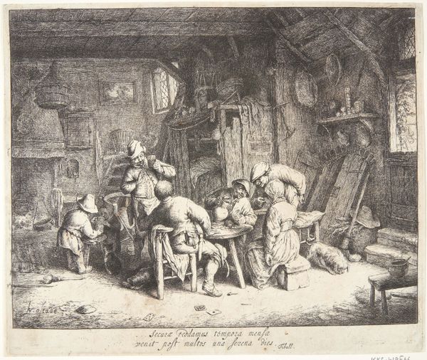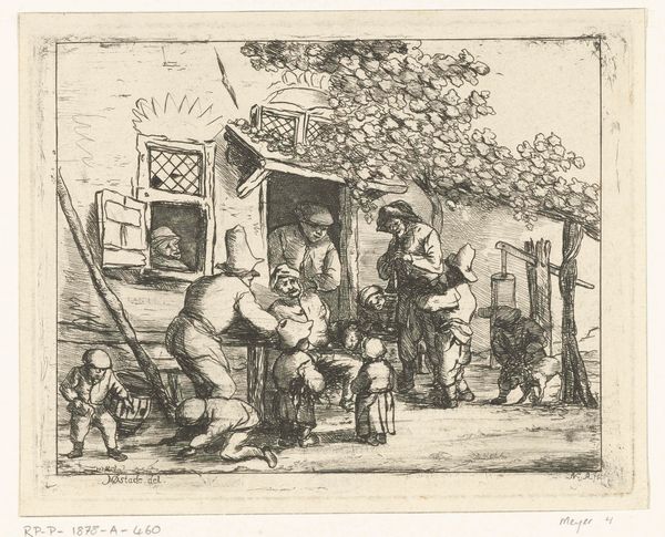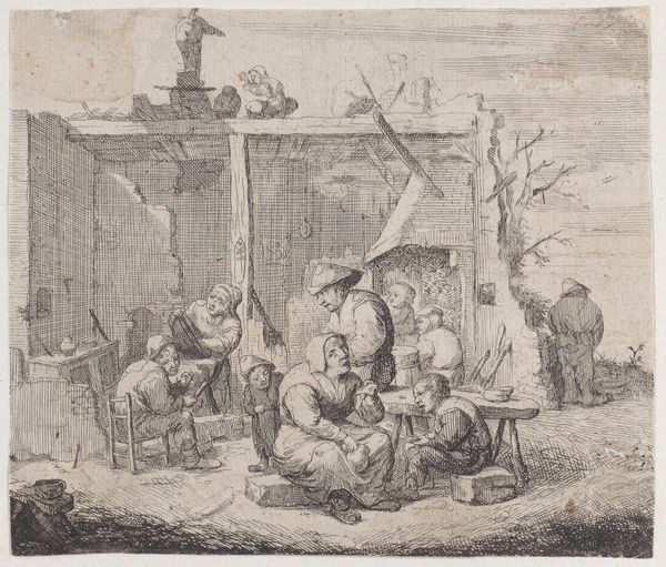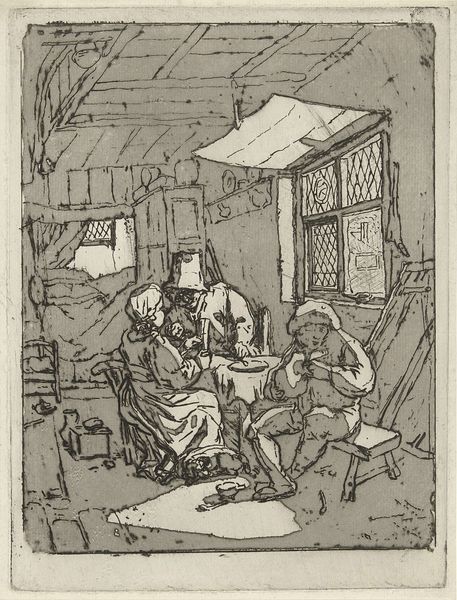 Isaac van Ostade created "The Painter's Workshop" using pen and brown ink, offering a glimpse into a cluttered, intimate space dominated by diagonal lines and subdued tones. The composition pulls us into the scene, where figures are arranged almost haphazardly, suggesting a world in disarray, or perhaps caught in a moment of casual activity. Consider how the use of line defines the forms and creates depth. The artist draws the viewer's eye across the tableau – from the sleeping figure in the lower left corner to the artist at work, and further into the depths of the workshop. The lines also serve to emphasize the textures of the rustic setting. The lack of vibrant colors directs our attention to the structural elements of the composition. How might the asymmetry and apparent disorder of this workshop reflect a broader cultural interest in the everyday, the unidealized? The artwork opens up to the idea that beauty and meaning can be found even in disarray.